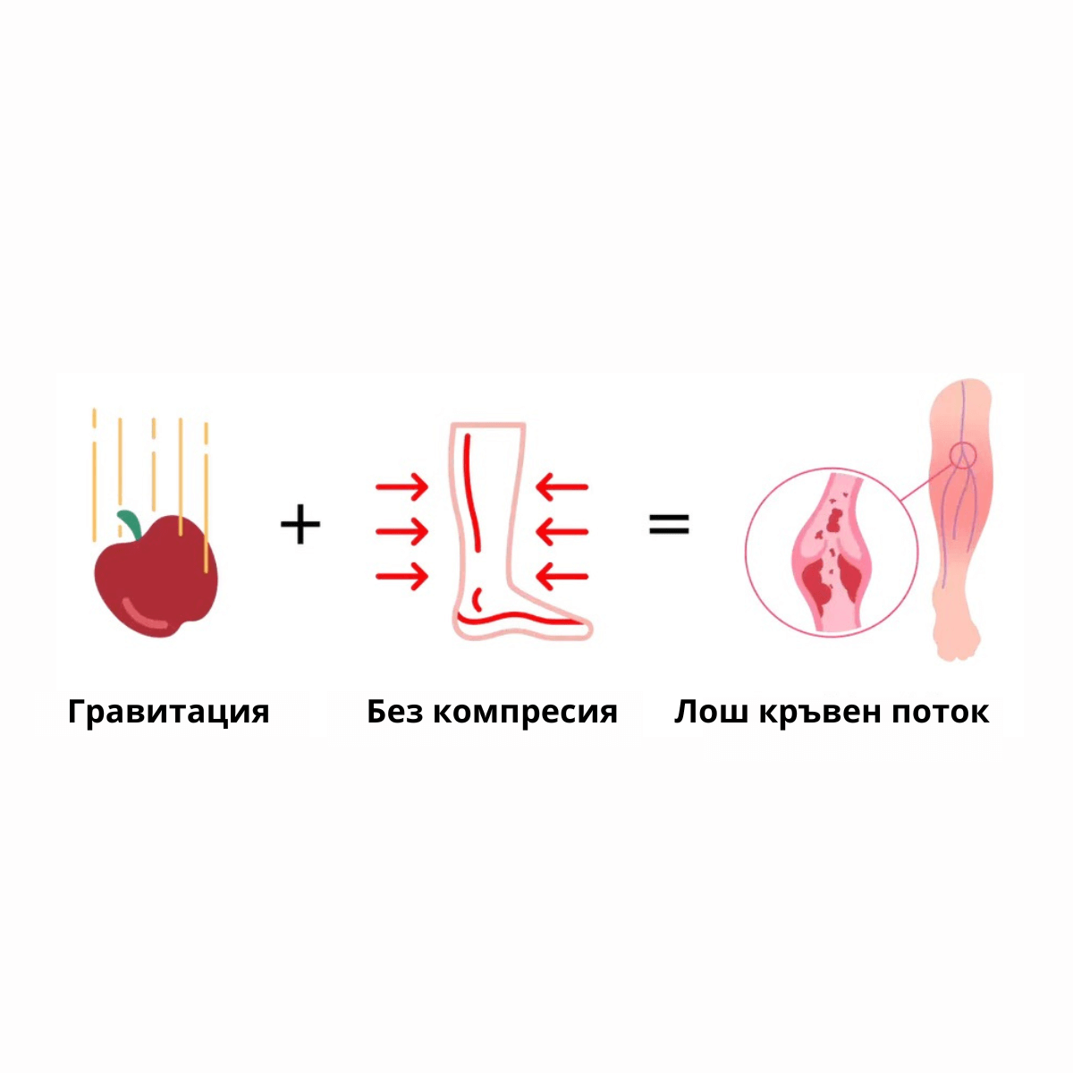 Градираната компресия означава, че натискът по крака е най-силен при глезена и постепенно намалява нагоре. Това помага на кръвта да се движи по-лесно обратно към сърцето, вместо да застоява в краката.